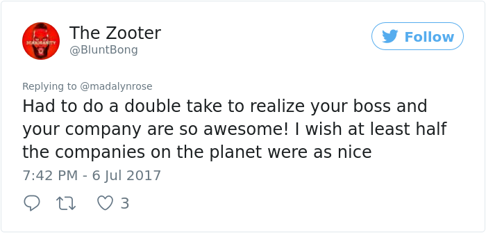 ▼網友們看到後議論紛紛,很遺憾,並不是所有老闆都像Madalyn的老闆那樣善解人意:「你的老闆和你的公司太棒了!希望世界上至少一半的公司能夠這麼好!」