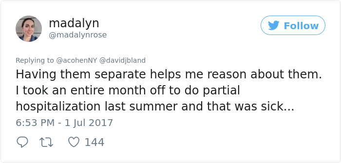 ▼Madalyn用自己的經歷回答了這個問題,去年夏天她一整個月都在接受半住院治療,那就是病假。她覺得自己還可以休假,因為這一整個月她並沒有休息。