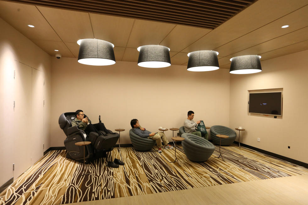 ▼這間「寄存室」非常人性化,不僅有舒服的座椅,還有很多娛樂設施,比如電視、按摩椅、雜誌、報紙等等,男生們可以安靜等待另一半,還能和其他人聊天打發時間。「寄存室」位於商場三樓,不過只有持金卡以上的男性會員可以使用。