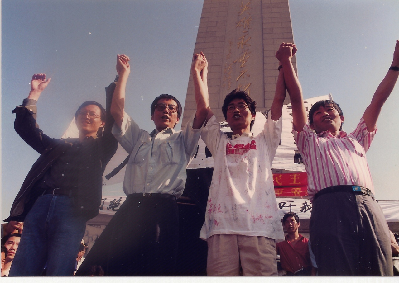 ▼劉曉波一回到中國就投入天安門示威行動,6月2日與周舵、高新和侯德健一起發表《六二絕食宣言》,加入絕食抗議的行列,深獲現場學生的信任。當他目睹64鎮壓時為了避免大規模流血,與軍方談判之後帶著數千名學生撤離,被稱為「天安門四君子」。