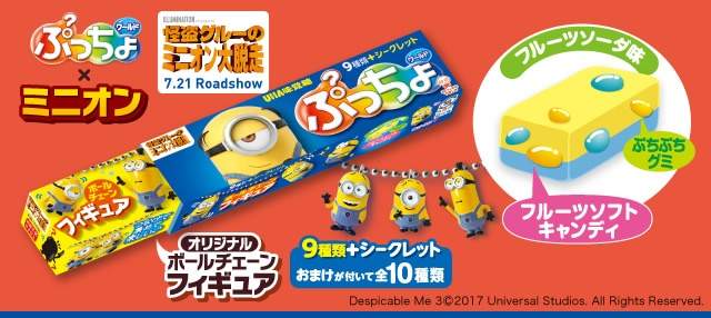 2017年07月15日日本有許多零食都喜歡跟電影或漫畫角色合作,聯名推出各種可愛限量的產品刺激銷量,這一次輪到可愛的小小兵啦!日本的UHA味覺糖「ぷっちょ」與小小兵聯名合作,推出了小小兵包裝的味覺糖,廣告還找來可愛的橋本環奈扮演可愛的「美少女小小兵」!