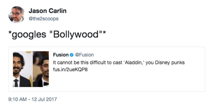 ▼阿拉丁的選角問題讓網友們操碎了心,有人無奈表示:「Google寶萊塢!」確實,寶萊塢演員們很符合阿拉丁這個角色的要求,他們還能唱能跳,性價比超高。