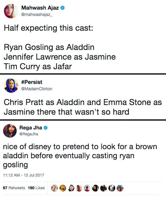 還有人開始猜迪士尼的名單:「阿拉丁:雷恩·葛斯林、茉莉:珍妮佛·勞倫斯、賈方:提姆·柯瑞」或者「阿拉丁:克里斯·普瑞特、茉莉:艾瑪·史東」。