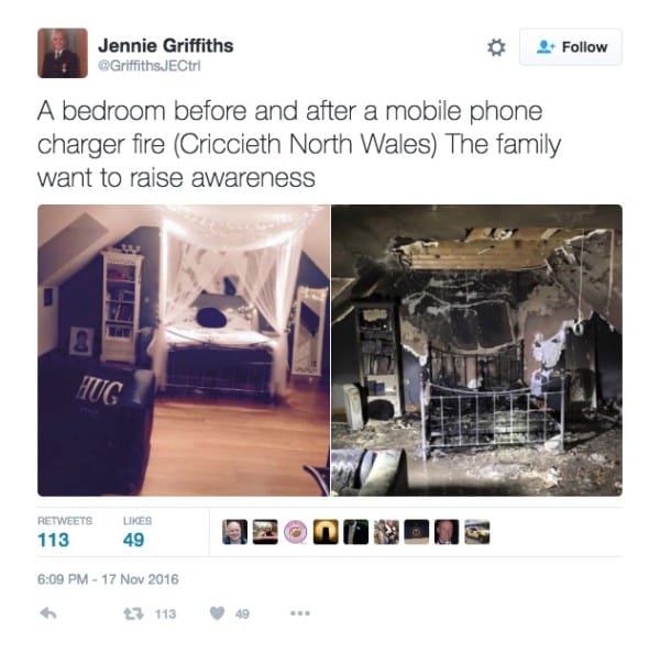▼給手機充電引發火災已經不是第一次了,之前消防局就分享過一個房間火災前後的對比照,那是一個小女孩的臥室,她在床上充電,結果變成了這樣。