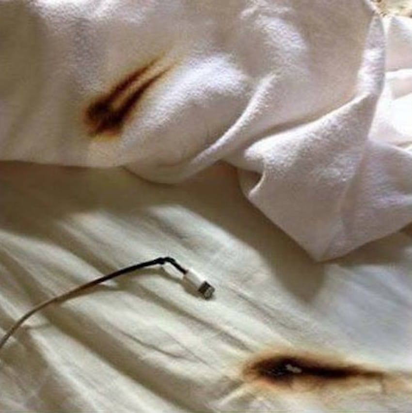 ▼前幾天,新罕布夏州消防局在臉書上分享了一系列照片,說:「調查顯示,53%的孩子將手機、iPad放在床上或者枕頭下充電。這非常危險。無法散熱的話,這些設備的溫度會越來越高,最後床會會被點燃。」