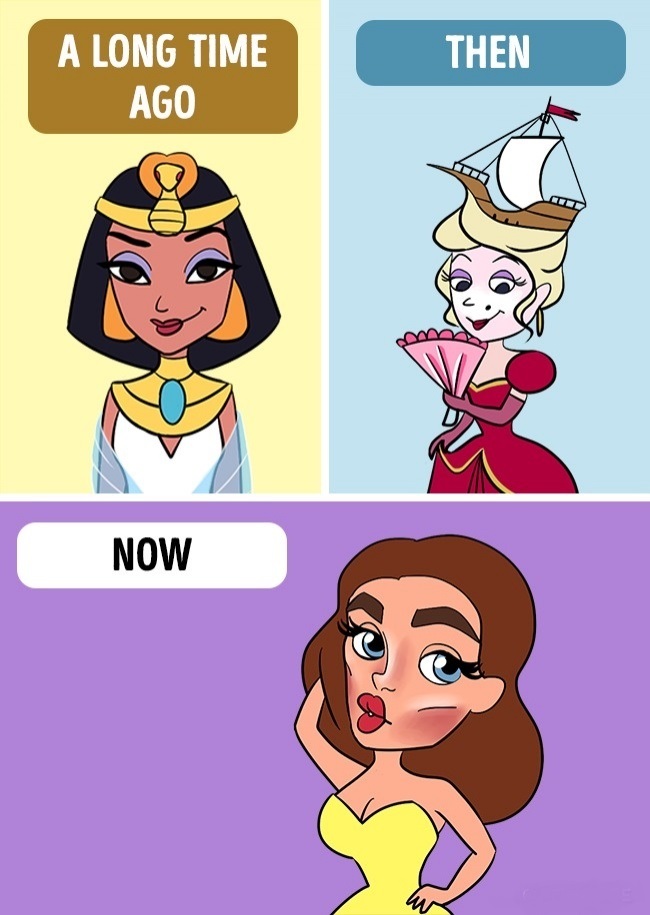 ▼非常久以前:埃及豔后妝。然後:中世紀妝。現在:意義不明妝。