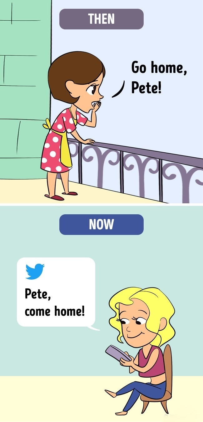 ▼從前:媽媽使出河東獅吼叫大家吃飯。現在:使用社交軟體聯繫。