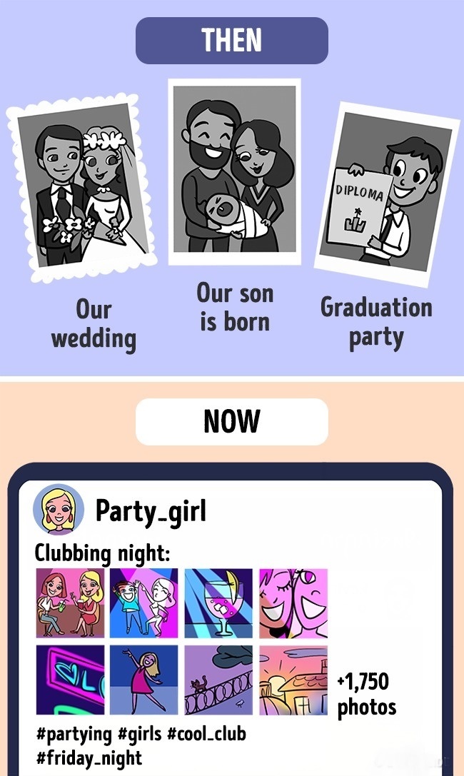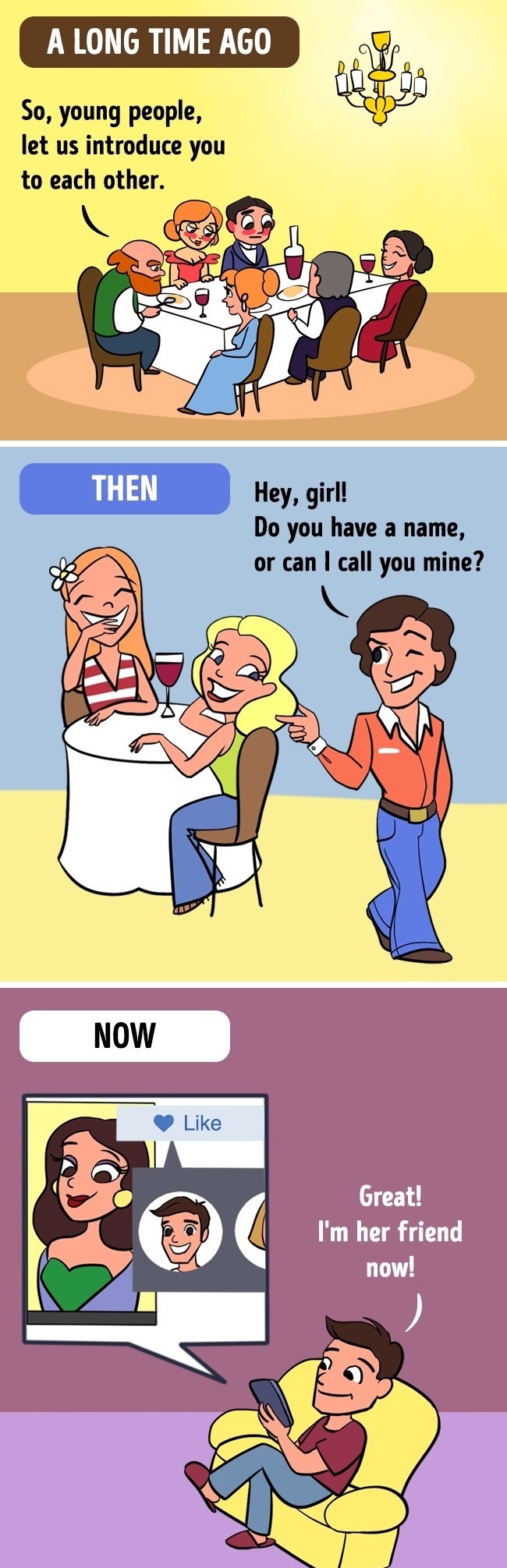▼從前:年輕人透過聚會自我介紹認識彼此,並且打電話邀約出門。現在:社群網站按下加好友,答應就變成了朋友,對彼此幾乎一無所知。