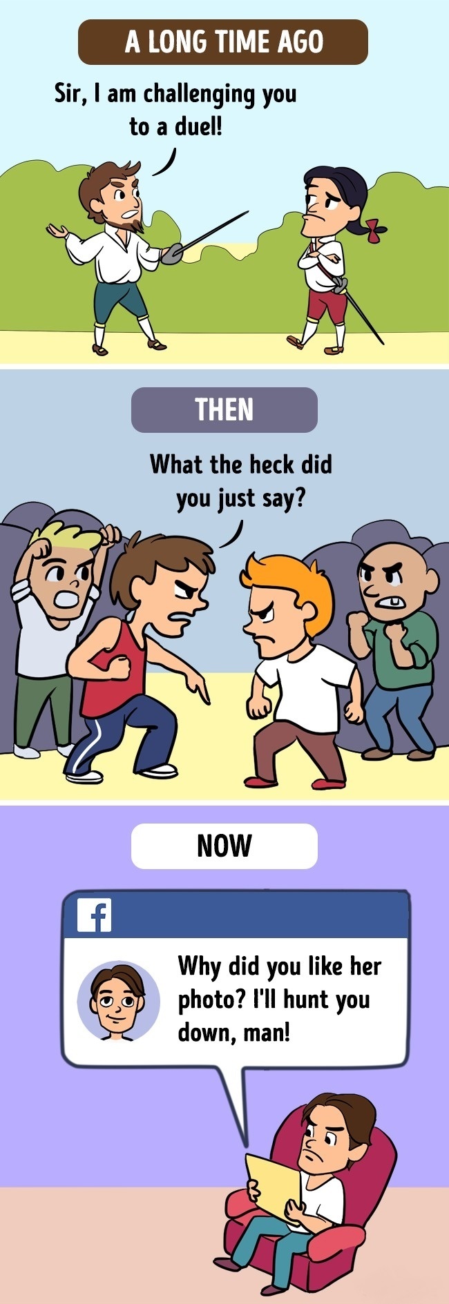 ▼很久以前:先生,我要跟你一對一決鬥!然後:你剛才TMD說了什麼!(有一堆人在背後壯聲勢)。現在:你喜歡那個女孩的照片,我會打敗你的。網路宣戰。(有種越來越文明的狀態啊?)