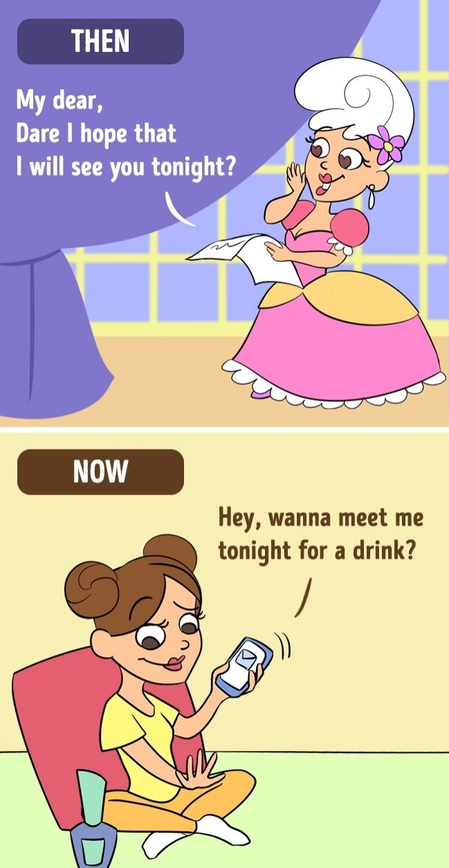 ▼從前:寫信傳達思念與相約。現在:簡訊快速傳遞邀約。