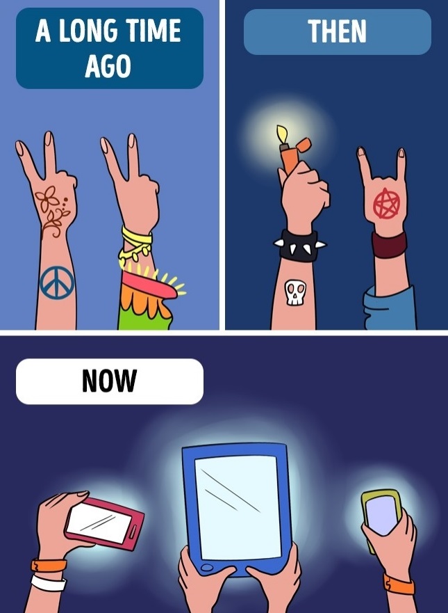 ▼很久以前:演唱會只有手勢跟塗鴉。然後:多了一點道具跟燈光。現在:演唱會都是手機跟平板。