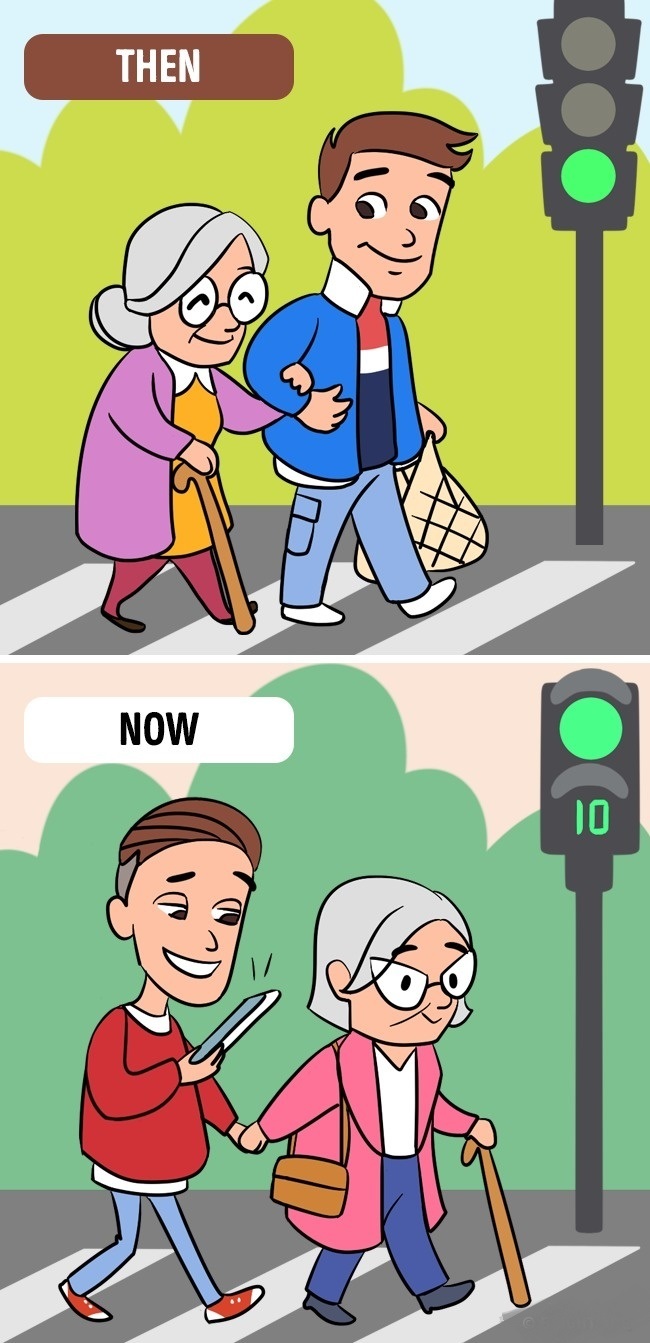 ▼從前:扶老奶奶過馬路。現在:老奶奶扶你過馬路。(不要再用手機了啊!)