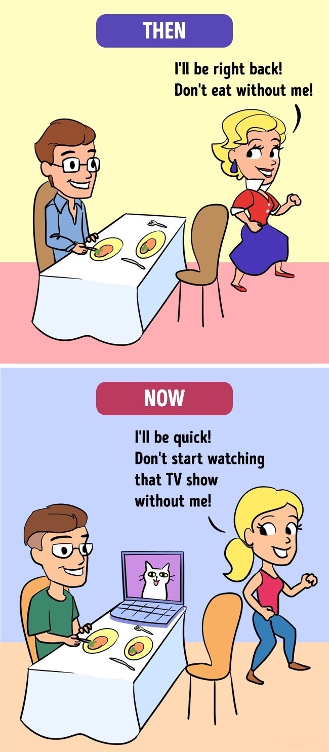 ▼從前:我馬上回來,記得等我一起開動喔!單純享受餐點。現在:吃飯配電腦、電視。(小編吃飯也不能沒有電視了!)