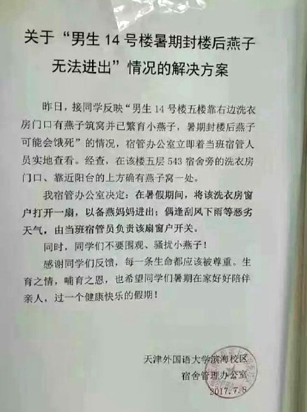 ▼宿舍管理員並不覺得麻煩,反而表示工作量不會增加,以前老城區有很多燕子會到家裡築巢,其實「很習慣了」。學校專門貼出了解決方法,說「每條生命都應該被尊重」,還勸學生們「不要圍觀、騷擾小燕子」,希望「同學們暑期在家好好陪伴親人」。