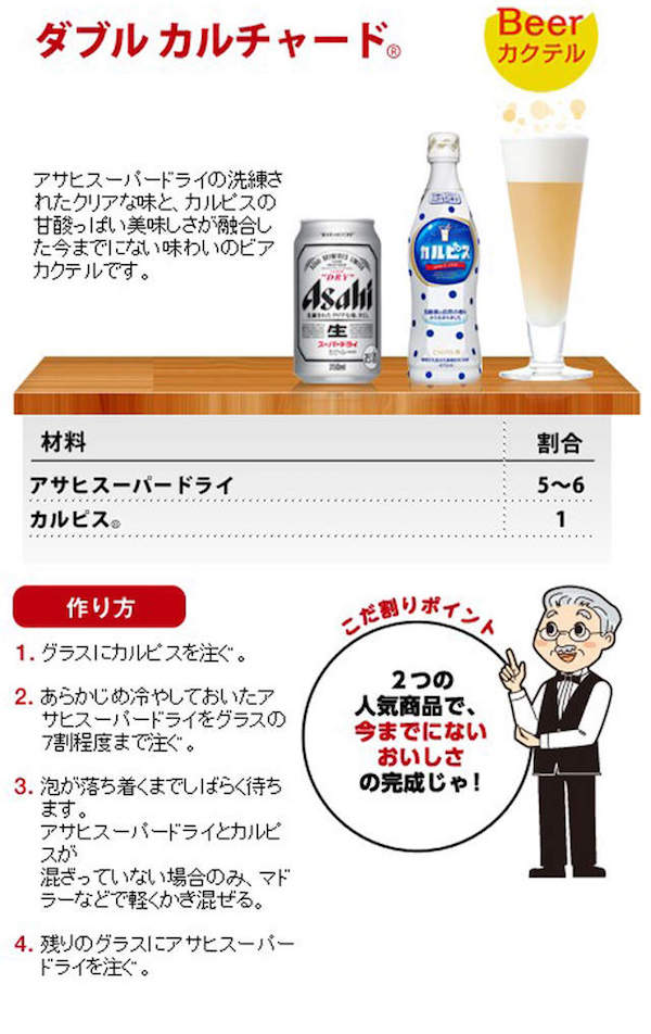 ▼這個方法讓18萬的網友都覺得很驚訝,但事實上,在朝日啤酒的官網上,早就有推薦這種「啤酒:可爾必思」等於「5:1」的做法惹!還有專業名稱叫「double clutured」(ダブルカルチャード)!