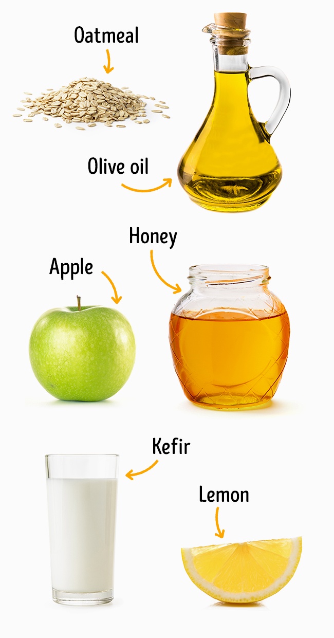 ▼祛痘去死皮面膜。準備三個小碗,第一個放入橄欖油和磨碎的麥片,第二個放入打碎的蘋果果肉和蜂蜜,第三個放入檸檬汁和酸乳酒。按順序分3步塗抹在臉上,每層塗抹前間隔5分鐘,最後塗抹完後保持15分鐘洗淨。這款面膜簡直是油性皮膚的剋星,還可以很好的去死皮。