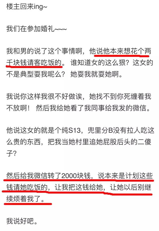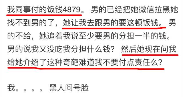 ▼男生覺得女生在耍自己,聊幾句就起身離開,還在微信封鎖了她。她找不到男生,就開始找原PO,哭哭啼啼讓原PO負責討回整頓飯錢。男生當然不肯,她又減到半價,讓男生付一半。男生覺得自己什麼都沒吃,根本沒理由付錢,他相親錢準備了2000元人民幣(約新台幣9000元)請女生吃飯,沒想到她點菜那麼瘋狂。他對原PO說:「誰知道女的這麼狠?這女的不是典型耍我呢麼?她耍我就耍她啊。」