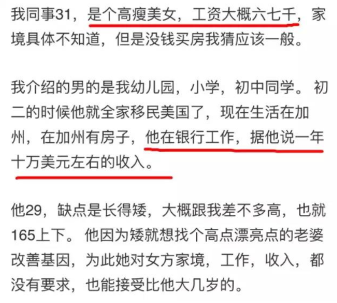 ▼她有一個男性好友,是幼稚園、小學、初中的同學。初二時那名男生全家移民美國,現在在銀行工作,一年的收入大約為10萬美元左右(約新台幣303萬元)。這個男生身高只有165公分,所以想找一個漂亮一些、高一點的老婆改善基因,他知道自己的身高是硬傷,所以對年齡沒什麼要求,大一些也沒關係。