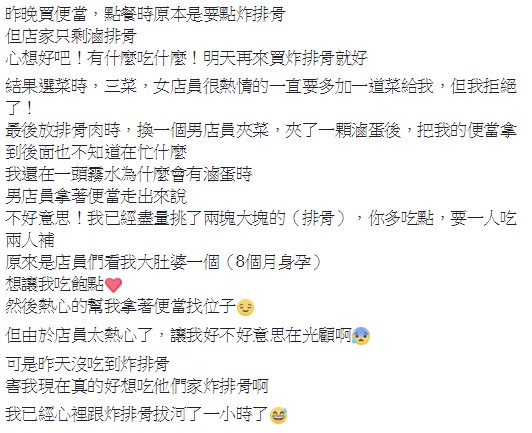 ▼這名懷孕8個月的孕婦網友在臉書《爆廢公社》上po文,表示自己到一家便當店去買便當,結果店員竟然幫她強行加菜。