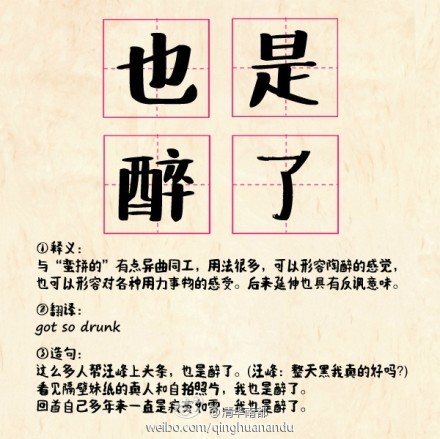 ▼也是醉了:這其實是武漢方言,男歌手「東來東往」有一首歌叫《我也是醉了》,這句話也因此走紅。一般表示很無奈。