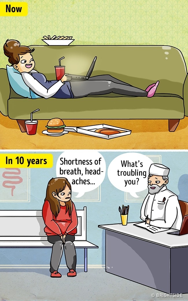 現在的你每天都喝著可樂,吃著炸雞,這些垃圾食品讓你享受了短暫的快樂。但是十年之後你就會嘗到惡果,你會發現自己容易呼吸急促、頭痛。