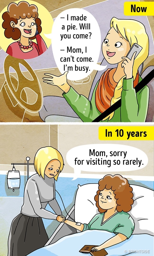 現在的你因為各種原因沒有去陪自己的父母。十年之後當媽媽已經年老生病時,你卻會後悔陪伴她的次數太少。