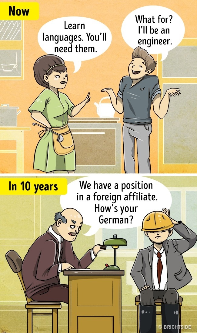 現在也許你會覺得學習外語對你的工作沒什麼用處,但是十年之後,也許會有一個海外工作機會需要一個精通外語的專業人才,那時你就會悔不當初。當然,學習不僅會對你的事業有幫助,還會拓寬你的視野,提升你的質素。