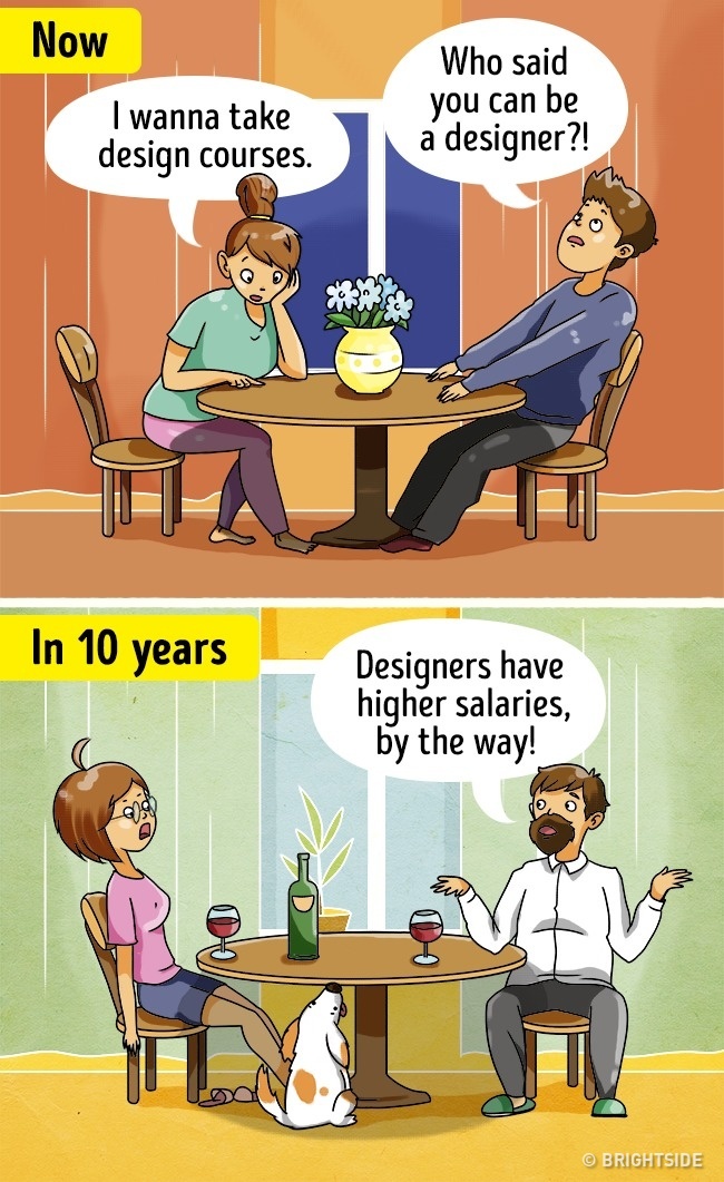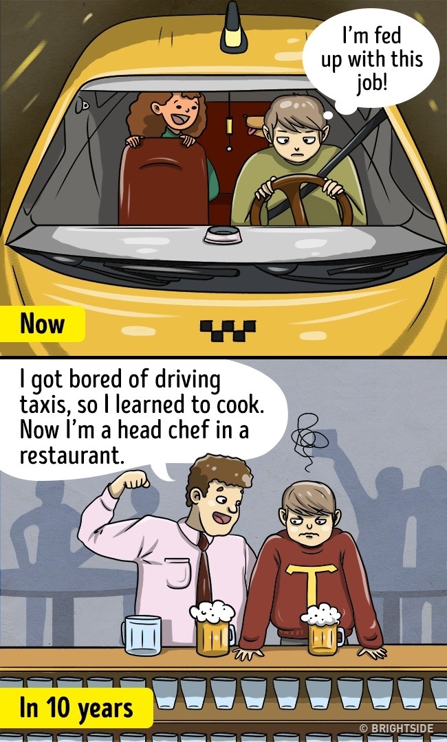 現在的你對自己的工作感到無比厭倦卻沒有勇氣改行,十年之後,你會發現你曾經的同事已經改行學習了烹飪並且已經成為了一家餐廳的主廚。我想,這滋味肯定不好受~