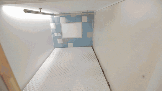 ▼膠囊房節省空間,非常舒服,但通風效果不好,光線也很差。本間貴史特別加裝了通風口,還設置了一個模擬12小時日光的小窗子,讓這個小空間不那麼壓抑。