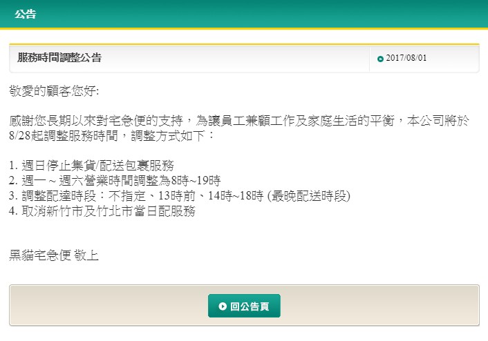 大家注意「黑貓宅急便8/28開始周日不送貨了」,公司這樣做是為了員工可以兼顧工作與家庭!