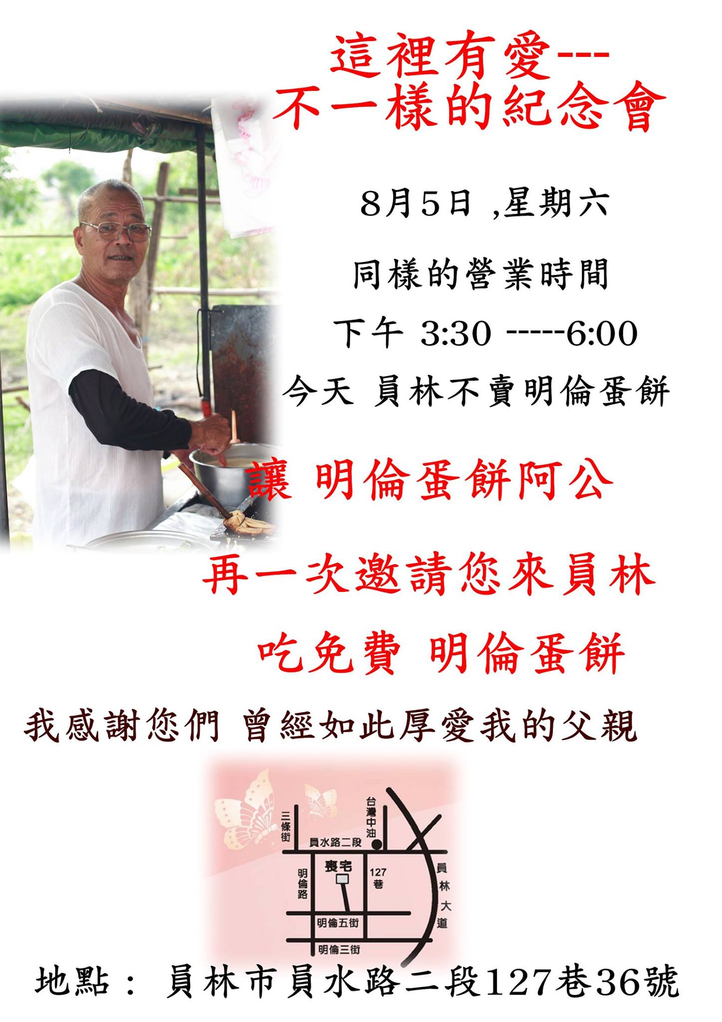 ▼張良汕更表示,為了感謝這幾年來客人對父親的厚愛,決定在5日下午3點半到6點舉辦紀念會,將在員林市明倫五街,也就是張尚書生活一輩子的三合院廣場,用父親生前使用30年的攤車,現做原汁原味的明倫蛋餅,歡迎眾人來追思並品嚐蛋餅滋味。