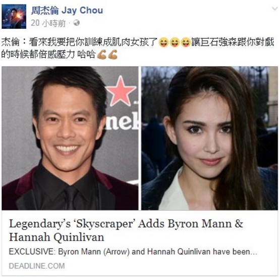 ▼而周董也在消息發布之後在臉書開心分享這則新聞,同時寫道:「看來我要把你訓練成肌肉女孩了,讓巨石強森跟你對戲的時候都倍感壓力,哈哈!」
