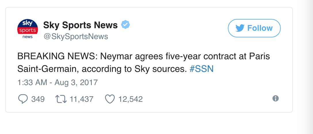 2017年08月06日內馬爾加入巴黎離開「老東家」巴薩的消息瞬間刷爆新聞頭條,這場突如其來的變化讓巴薩球迷有些難以適應。失去內馬爾的巴薩,正在為尋找新的球員忙碌。內馬爾與巴黎簽訂5年的合約,巴黎將支付不菲的薪水,僅僅內馬爾的轉會費就高達的2.22億歐元(約台幣79億元)。