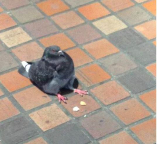 日本網友在人行道發現一隻「呆坐小胖鴿」覺得略有違和感,看清牠的「大叔坐姿」後立馬笑噴!