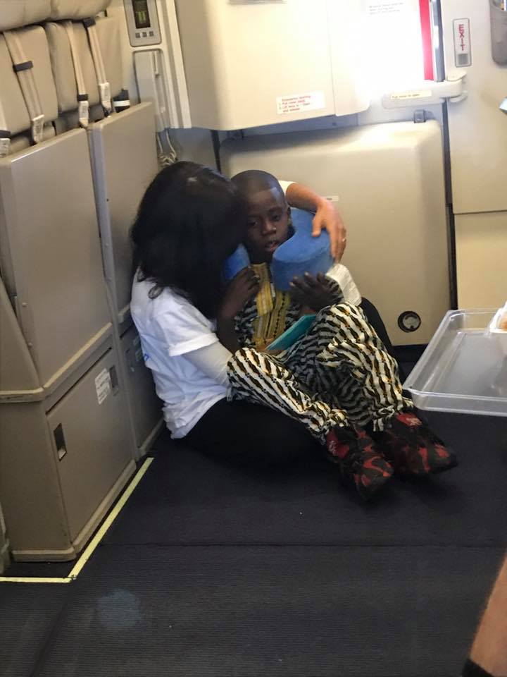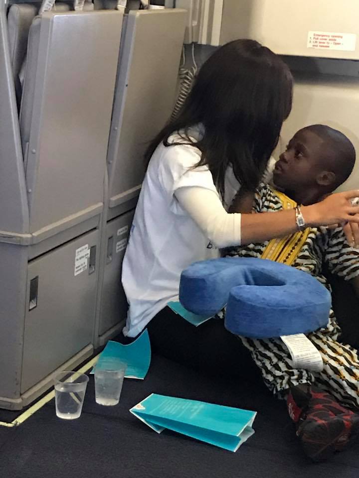 ▼這時候,在殘疾青年福利機構工作的蘿秋站了起來,她坐到小男孩身旁,並堅定對他敞開懷抱。這位小男孩一開始非常困惑,兩人僵持了好一陣子,最後才遲疑握住蘿秋的手。蘿秋把他帶到機艙角落,輕撫他的背,並低聲唱歌,緩和他不安的情緒。
