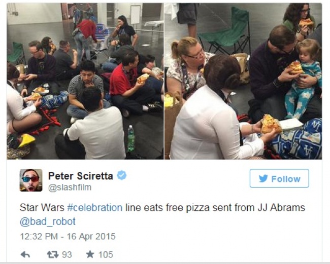 ▼11. 星球大戰的導演 JJ Abrams和盧卡斯電影公司總裁凱瑟琳肯尼迪一起為粉絲帶來了披薩,慶祝一年一度的「星球大戰慶典」。