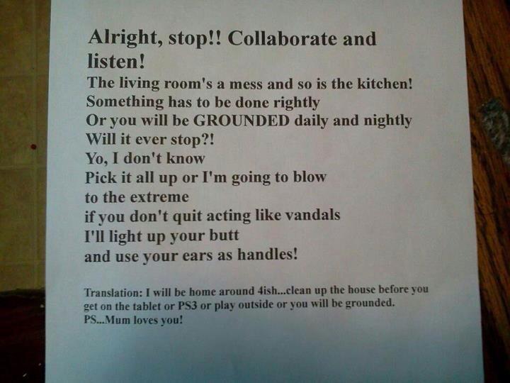 ▼8. 「我四點左右到家,把家打掃乾淨前,不許玩平板、PS3,不許出門,不然你會被禁足。PS:媽媽愛你。」