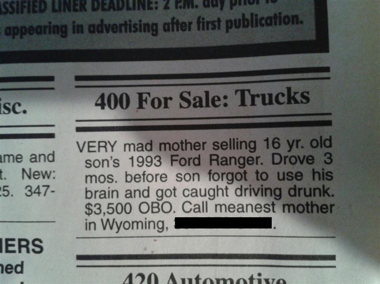 ▼5. 「我是一位非常憤怒的媽媽,要賣16歲兒子的1993年產的福特Ranger。他剛開這台車三個月,最近忘記用腦被抓到酒駕。車子售價3500美元(約新台幣11萬元),可議。請洽懷俄明州最壞的媽媽。」