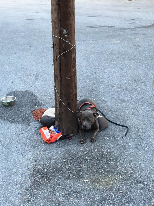 ▼狗狗被發現時身邊只有一盆水和一小袋狗糧,身上還套著散步用的胸背牽繩,被拴在柱子上無法離開。