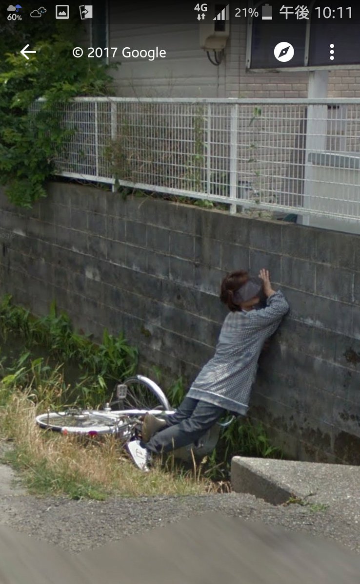他在Google街景看到「日本阿姨騎自行車摔進水溝」,整個人貼在牆壁的畫面讓大家都內疚噴笑啊!