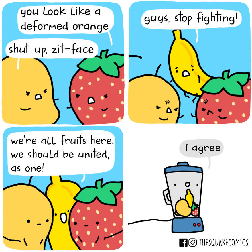 香蕉:「大家不要吵啦,我們都是水果啊,應該團結一點。」