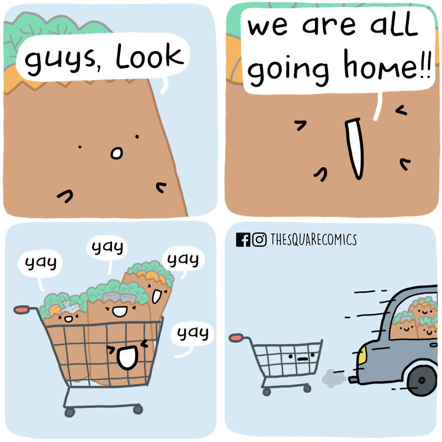 ▼購物袋:「大家快看!我們要回家了!」購物袋、購物車:「耶!」