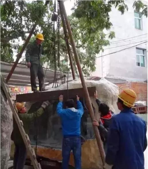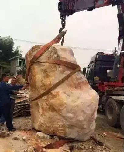 ▼這塊石頭重達10余噸,並且在大山深處,山上沒有通車,於是請當地的運石工幫忙,先修了一條公路,最後用吊車才艱難的把石頭運下了山。