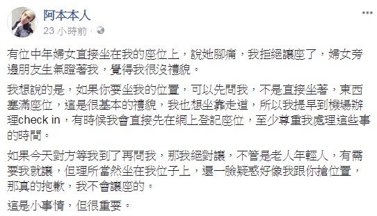 ▼《模範棒棒糖》成員出生的阿本近幾年雖然已經由幕前轉到幕後發展,不過他仍經常在社群媒體上與粉絲分享他的近況。他19日時在臉書po了一篇文章,講述自己搭飛機時竟然發現自己的位置被一名中年婦女佔據了,臉上還一副理所當然的樣子。(圖片取自:阿本臉書)