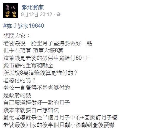 2017年09月24日坐月子是女性生產之後的必經過程,對於女性身體的恢復也異常重要,它還能改變人的體質,對於普通人來說很有必要。而很多有經濟能力的人會選擇去月子中心坐月子,這無可厚非,但近日一位網友在「靠北婆家」指出,老婆應該用自己的錢坐月子,而不應該用政府的生育獎勵金來坐月子,結果引來網友們的一陣炮轟。