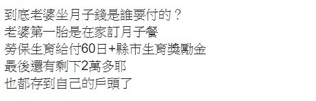 ▼原PO說,第一胎老婆在家訂月子餐,有60天的勞保生育給付、還有縣市生育獎勵金,最後還剩下2萬多、通通存到老婆的戶頭,但他一直覺得那不是老婆的錢,是政府的錢;沒想到這一胎,老婆堅持要坐「好一點」的月子,預算8萬,可以全部用勞保、縣市獎勵補助,但他認為「自己要選擇做好一點的月子,錢本來就要自己想辦法」,怎麼可以花政府的?