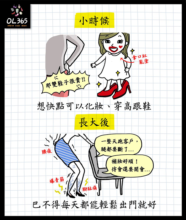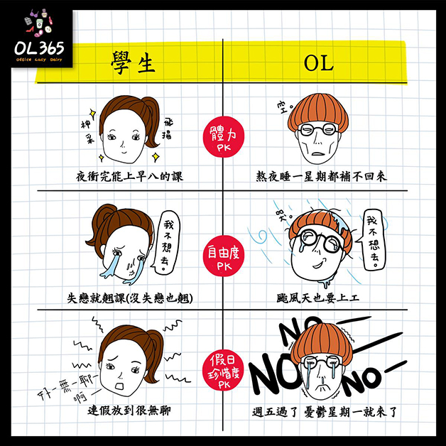 2017年09月24日很多人懷念學生時代,緬懷的並不是幼稚、衝動的自己,而是那種用不完的活力。出社會後,人真的能360度大改變,從生活方式到心態都有了很多不同。插畫家「OL 365」就用畫筆展示出了這種改變,你也是這樣嗎?