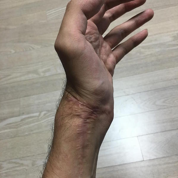 ▼James在2015年6月與朋友聚會時,意外被餐廳玻璃門壓倒,導致左手腕受傷。當初醫生就告知他有可能會截肢,但他還是努力復健,希望能救回左手,重新回到樂團彈吉他。
