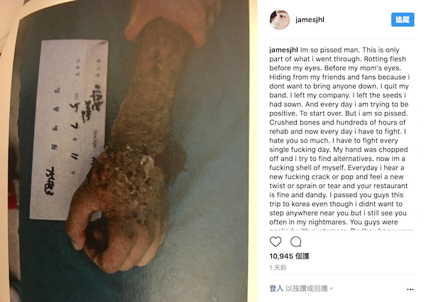 ▼James曾在傷後試圖改彈keyboard,可惜復原狀況仍不理想,為了不拖累團員,便決定在今年2月退團,年僅29歲的演藝事業因此告終。他悲訴說:「我退了團,離開公司,放棄那些我曾經播下的種子。每一天,我都試著積極振作,重新來過,但我現在真的好憤怒!」