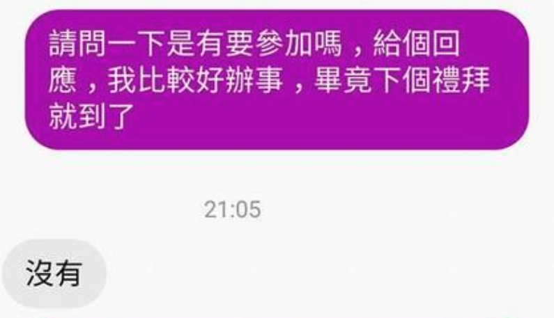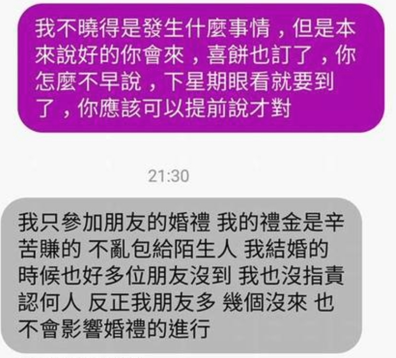 ▼到了婚禮前一週,女網友再度向對方確認,沒想到對方竟然反口表示「沒要要去」,女網友不滿地表示「你怎麼不早說」,沒想到對方竟然超嗆的回覆:「我只參加朋友的婚禮,我的禮金是辛苦賺的,不亂包給陌生人,我結婚的時候也好多朋友沒到,我也沒指責任何人,反正我朋友多,幾個沒來也不會影響婚禮的進行。」